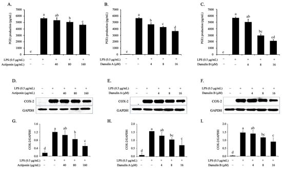 Effects of AP, DA, and DB on PGE2 production and COX-2 expression in LPS-stimulated RAW264.7 cells. The cells (2 × 106 cells) are cultured in 100 mm dishes and treated with AP, DA, and DB for 4 h, then incubated with LPS (500 ng/mL) for another 20 h. PGE2 accumulated in the culture medium is analyzed using PGE2 ELISA; (A) AP, (B) DA, (C) DB. Protein expression of COX-2 is determined using Western blot analysis; (D) AP, (E) DA, (F) DB. (G–I) Quantitative data of (D–F) were analyzed using ImageJ software. GAPDH served an internal control. The data are presented as the mean ± SEM of three independent experiments. a–e Mean values designated by different superscript letters are significantly different between groups at p < 0.05, as determined by Duncan’s multiple-range test.