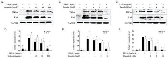 Effects of AP, DA, and DB on pro-inflammatory cytokines in LPS-stimulated RAW264.7 cells. The cells (2 × 106 cells) are cultured in 100 mm dishes and treated with AP, DA, and DB for 4 h, then incubated with LPS (500 ng/mL) for another 20 h. Protein expression of TNF-α and IL-6 is determined using Western blot analysis; (A) AP, (B) DA, (C) DB. (D–F) Quantitative data of (A–C) are analyzed using ImageJ software. GAPDH served as an internal control. The data are presented as the mean ± SEM of three independent experiments. a–d Mean values designated by different superscript letters are significantly different between groups at p < 0.05, as determined by Duncan’s multiple-range test.