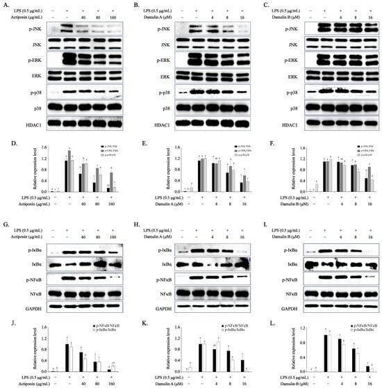 Effects of AP, DA, and DB on MAPKs and NF-κB pathways in LPS-stimulated RAW264.7 cells. The cells (2 × 106 cells) are cultured in 100 mmm dishes and treated with AN, DA, and DB for 1 h, then incubated with LPS (500 ng/mL) for another 30 min. Protein expression of MAPKs (t/p-ERK, t/p-JNK, and t/p-p38) and NF-κB (t/p-IκB-α and t/p-p65) is determined using Western blot analysis. MAPKs: (A) AP, (B) DA, (C) DB, NF-κB (t/p-IκB-α and t/p-p65); (G) AP, (H) DA, (I) DB. (D–F,J–L) Quantitative data of (A–C,G–I) are analyzed using ImageJ software. GAPDH served as an internal control. The data are presented as the mean ± SEM of three independent experiments. a–e Mean values designated by different superscript letters are significantly different between groups at p < 0.05, as determined by Duncan’s multiple-range test.