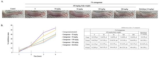 The anti-inflammatory effects of AP were evaluated 4 h after carrageenan injection in a mouse model of carrageenan-induced paw edema. Compared to the control group, the group injected with carrageenan alone showed a significant increase in paw thickness, whereas the experimental group, to which AP (30, 50, 100, and 200 mg/kg body weight) was orally administered 1 h prior, showed a concentration- and time-dependent decrease in paw thickness (Figure 6). The slope of the edema inhibition rate by AP rapidly in-creased 2 h after carrageenan injection. In the 30, 50, 100, and 200 mg/kg groups, the inhibition rates of edema were 13%, 13%, 15%, and 16%, respectively, at 2 h, and 36%, 39%, 40%, and 49%, respectively, at 4 h (Figure 6B). The edema-inhibitory effect in the 200 mg/kg group was similar to that in the positive control group at 4 h (Figure 6B). The morphological characteristics 4 h after carrageenan injection are illustrated in Figure 6A. These results suggest that oral administration of AP at concentrations of 30, 50, 100, and 200 mg/kg significantly inhibited carrageenan-induced paw edema. These results suggest that the oral administration of AP has an anti-inflammatory effect, as verified by its inhibitory effect on carrageenan-induced paw edema.
