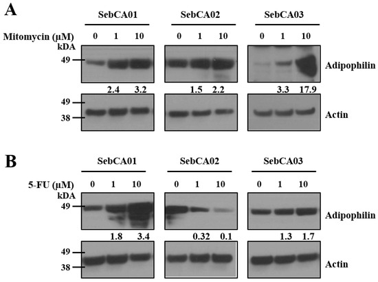 Sebaceous differentiation after therapy. (A) Mitomycin-C treatment increased adipophilin protein expression in all three lines, suggesting that it can promote sebaceous differentiation of these carcinoma cells. (B) While 5-FU increased adipophilin expression in SebCA01 and SebCA03, a decrease was seen in SebCA02. Numbers between the blots with 1 and 10 μM treatment represent adipophilin expression normalized to actin.