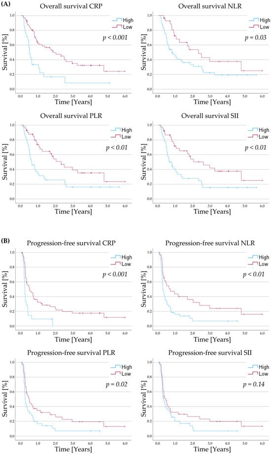 Kaplan–Meier survival curves illustrating (A) overall survival and (B) progression-free survival, comparing patients with high versus low levels of each inflammation index. C-reactive protein (CRP), neutrophil-to-lymphocyte ratio (NLR), platelet-to-lymphocyte ratio (PLR), and systemic immune inflammation index (SII).