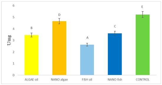 The activity of SOD1 in the treatment groups is shown in Figure 2 and Table 1. The lowest activity was recorded in piglets from gilts supplemented with algal oil, fish oil, and nano fish oil (average 1.34 U/mg). Increased activity was found in piglets born to the gilt supplemented with nano algal oil (1.57 U/mg), while the highest level of activity was observed in animals born to the control gilt (3.19 U/mg). The pattern of SOD2 activity differed from that of SOD1 (p < 0.01). The lowest activity was observed in piglets from the gilt supplemented with algal oil (1.65 U/mg), followed by nano algal oil (1.94 U/mg), fish oil (1.73 U/mg), and nano fish oil (1.83 U/mg). The highest activity was again recorded in piglets born to the control gilt (3.74 U/mg) (Figure 2).