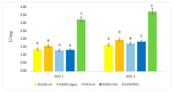 Activity (U/mg) of superoxide dismutase enzymes (SOD1 and SOD 2) in the liver of newborn piglets (first day of life) from gilts fed diets supplemented with fish oil, algal oil, and their nanoparticles. Bars labelled with different letters (A–E) differ significantly (p < 0.01).