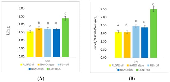 Differences in the activity (nmol/NADPH/min/mg) of catalase (CAT) (A) and glutathione peroxidase (GPx) (B) in the liver of newborn piglets (first day of life) from gilts fed diets supplemented with fish oil, algal oil, algal oil, and their nanoparticles. Bars labelled with different letters (A–C) differ significantly (p < 0.05).