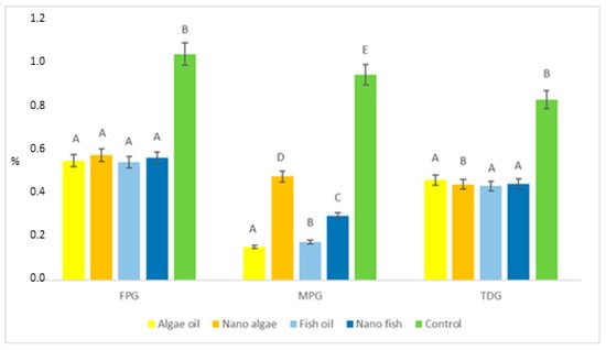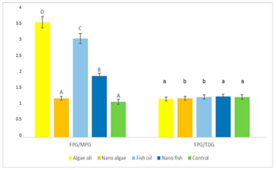 FPG activity relative to MPG, expressed as the FPG/MPG ratio (Figure 5, Table 1) was lowest (p < 0.01) in piglets born to gilts supplemented with nano algal oil and the control gilts (average 1.16); higher in piglets from the gilt supplemented with nano fish oil (1.90); and highest in piglets from gilts supplemented with fish and algal oils (average 3.33). No differences were observed in the activity of FPG compared to TDG (FPG/TDG ratio).