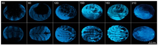 - Santos, V.T.; Ribeiro, L.; Fraga, A.; de Barros, C.M.; Campos, E.; Moraes, J.; Fontenele, M.R.; Araujo, H.M.; Feitosa, N.M.; Logullo, C.; et al. The embryogenesis of the Tick Rhipicephalus (Boophilus) microplus: The establishment of a new chelicerate model system. Genesis 2013, 51, 803–818. [Google Scholar] [CrossRef]