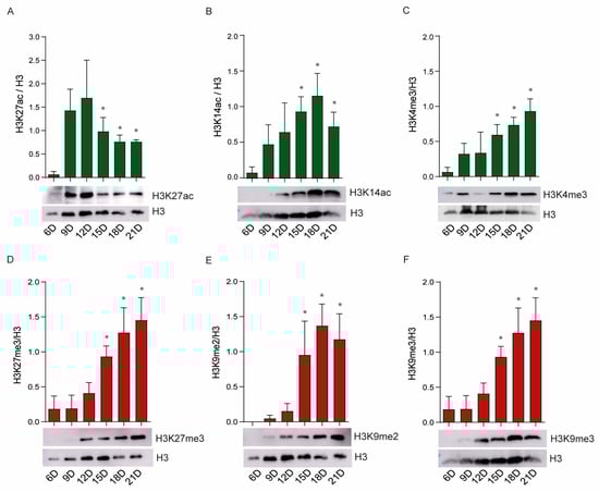 - Pasini, D.; Malatesta, M.; Jung, H.R.; Walfridsson, J.; Willer, A.; Olsson, L.; Skotte, J.; Wutz, A.; Porse, B.; Jensen, O.N.; et al. Characterization of an antagonistic switch between histone H3 lysine 27 methylation and acetylation in the transcriptional regulation of Polycomb group target genes. Nucleic Acids Res. 2010, 38, 4958–4969. [Google Scholar] [CrossRef] [PubMed]