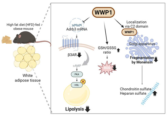 Physiological functions of WW domain-containing E3 ubiquitin protein ligase 1 (WWP1) in obese white adipose tissue (WAT). β3ARs, which are encoded by the Adrb3 gene, promote lipolysis by increasing cAMP levels; this activates PKA, which subsequently phosphorylates HSL. WWP1 suppresses Adrb3 mRNA expression and HSL phosphorylation. WWP1 also suppresses paraquat and palmitic acid-induced cellular ROS levels by regulating the GSH/GSSG ratio in WAT. Finally, WWP1 suppresses monensin-induced Golgi apparatus fragmentation and the Golgi stress response through localization to the Golgi apparatus via its N-terminal C2 domain. Therefore, WWP1 may function as a cellular stress regulator by mitigating ROS and the associated Golgi stress that are elevated in obese WAT. β3AR: beta 3-adrenergic receptor; Adrb3: adrenoceptor β3; cAMP: cyclic AMP; PKA: protein kinase A; HSL: hormone-sensitive lipase; ROS: reactive oxygen species; GSH: glutathione; GSSG: glutathione disulfide.