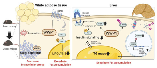 In this review, we summarized the molecular mechanisms of WWP1 in obesity-related metabolic dysfunction, particularly in WAT and the liver. In WAT, WWP1 appears to play dual roles: first, obesity-induced, p53-dependent upregulation of WWP1 suppresses catecholamine-stimulated lipolysis through downregulation of Adrb3 expression; and second, WWP1 contributes to protection against intracellular stress, including oxidative and Golgi stress. Although the direction of regulation remains unclear, ROS regulates both lipolysis and lipogenesis [86]. Future studies should explore the detailed mechanisms underlying redox regulation and lipid homeostasis in adipocytes, particularly in relation to WWP1. In the liver, WWP1 suppresses insulin signaling and promotes the accumulation of TG, which exacerbates hepatic steatosis. The molecular mechanisms underlying the regulation of MASLD remain largely unknown; however, the quantitative regulation of WWP1 may be efficacious as a target for MASLD. In conclusion, targeting WWP1 may be useful in the treatment of obesity and related metabolic disorders through the dual functions of promoting lipolysis of WAT and insulin sensitivity in the liver (Figure 2).