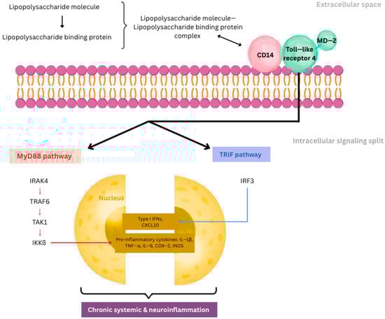 Within the CNS, LPS either crosses the compromised BBB or signals via vagal afferents to activate the hypothalamus and brainstem inflammatory circuits. In the brain parenchyma, LPS stimulates microglial TLR4, promoting their transition to a reactive state characterized by enhanced production of ROS, TNF-α, IL-1β, and prostaglandins, often accompanied by the formation of the NLRP3 inflammasome. The resulting chronic neuroinflammatory state disrupts synaptic transmission, contributes to dendritic spine loss, and enhances the phosphorylation and aggregation of tau and alpha-synuclein—core pathological processes in Alzheimer’s and Parkinson’s disease, respectively []. Persistent low-dose LPS exposure, as seen in chronic gut leakage, subtly maintains a low-grade inflammatory tone systemically and centrally. This steady-state activation is sufficient to drive oxidative stress, mitochondrial dysfunction, and impaired clearance of neurotoxic proteins, leading to progressive neuronal injury over time []. LPS operates as a molecular bridge between peripheral and central inflammation. Its ability to engage innate immune receptors, reprogram cellular metabolism, compromise the BBB, and chronically activate microglia underlies its pivotal role in inflammaging and the pathogenesis of neurodegenerative diseases [].