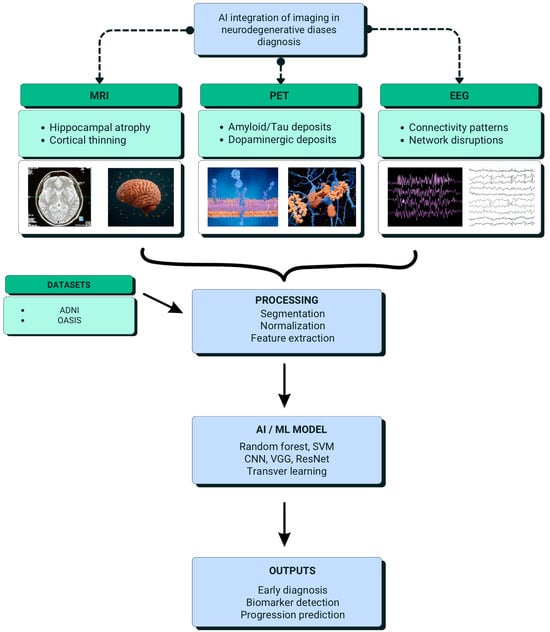 AI integration of multimodal imaging in neurodegenerative disease diagnosis. MRI, PET, and EEG provide structural, molecular, and functional biomarkers that undergo preprocessing and feature extraction before being analyzed by AI/ML models such as random forest, SVM, and deep learning networks (CNN, ResNet, and VGG). Large imaging datasets (ADNI and OASIS) supply data for model training and validation. The outputs include biomarker detection, early diagnosis, disease stratification, and prediction of disease progression.