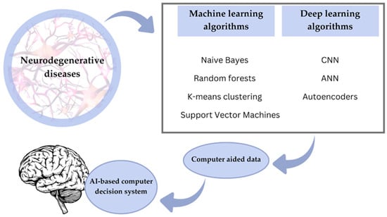 These models improve through iterative processes of forward and backward propagation, which optimize the parameters to minimize the gap between the predictions and actual results. This enables them to make accurate predictions and handle complex tasks. Generally, convolutional neural networks, which were initially used for MRI and PET scans, are considered very prominent for AD detection. These deep learning architectures are critical in early detection by performing different imaging modalities for Alzheimer’s dementia using various datasets. The first few layers in these models detect low-level features, edges, or textures, and further layers combine these low-level features to detect complex patterns linked with AD. The depth and computational power of deep learning let subtle biomarkers and abnormalities, often the harbinger of the disease, be detected. This capability for early detection offers significant potential for prompt intervention and better management of AD []. Figure 3 summarizes the most important aspects of AI-based machine learning and deep learning in neurodegenerative disease diagnosis.
