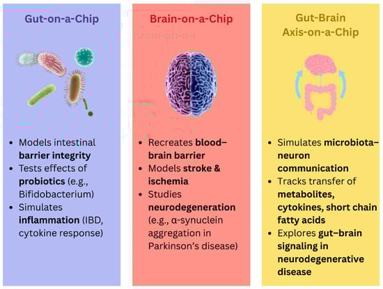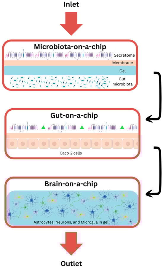 - Raimondi, M.T.; Albani, D.; Giordano, C. An organ-on-a-chip engineered platform to study the microbiota–gut–brain axis in neurodegeneration. Trends Mol. Med. 2019, 25, 737–740. [Google Scholar] [CrossRef] [PubMed]