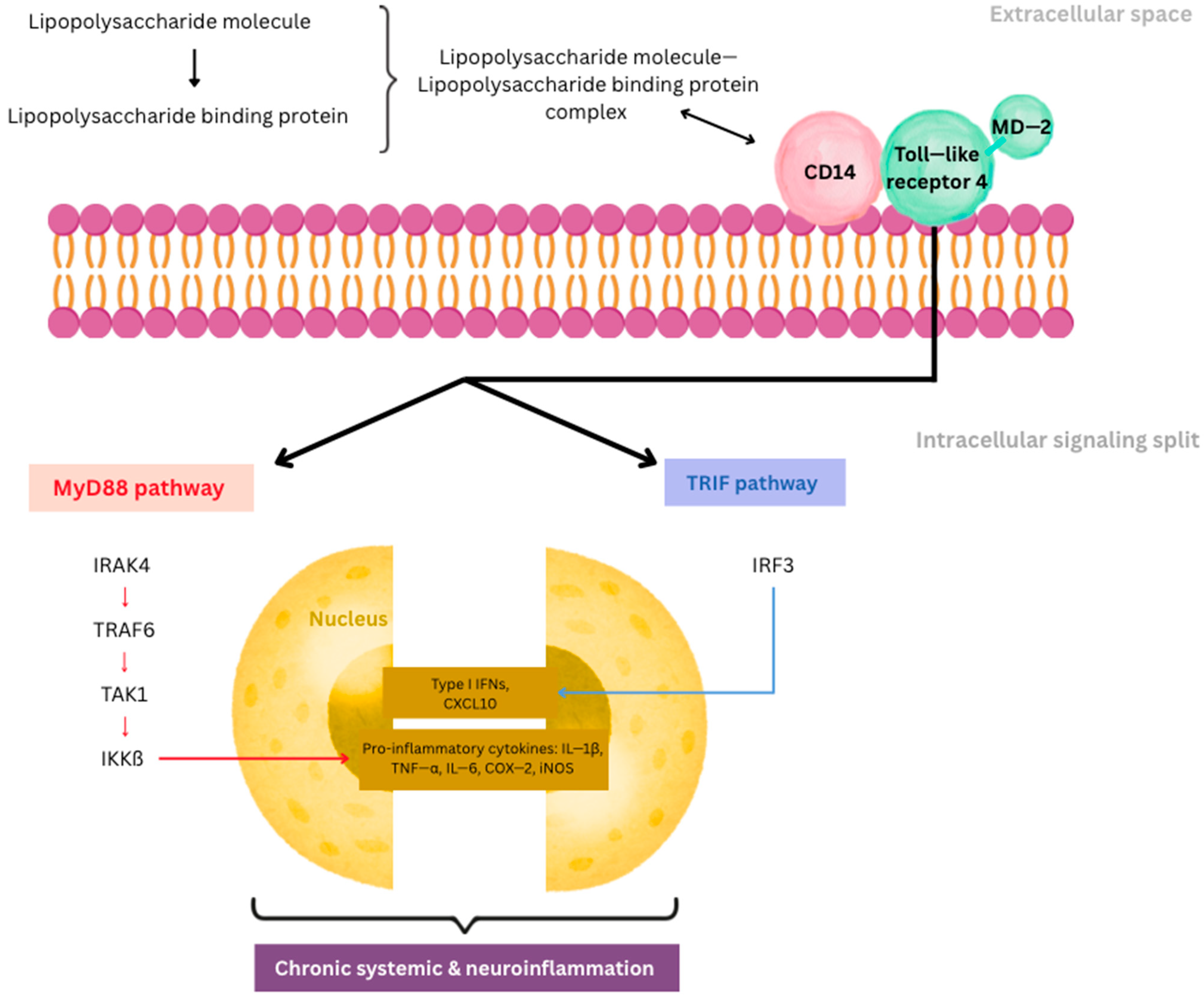 Gut–brain axis and systemic inflammation | Gut dysbiosis, LPS translocation, TLR4–MD2–CD14 signaling, immunometabolism | BBB disruption, peripheral priming of microglia, chronic low-grade CNS inflammation | [9,10,11,12,13,14,15,16,17,18] |