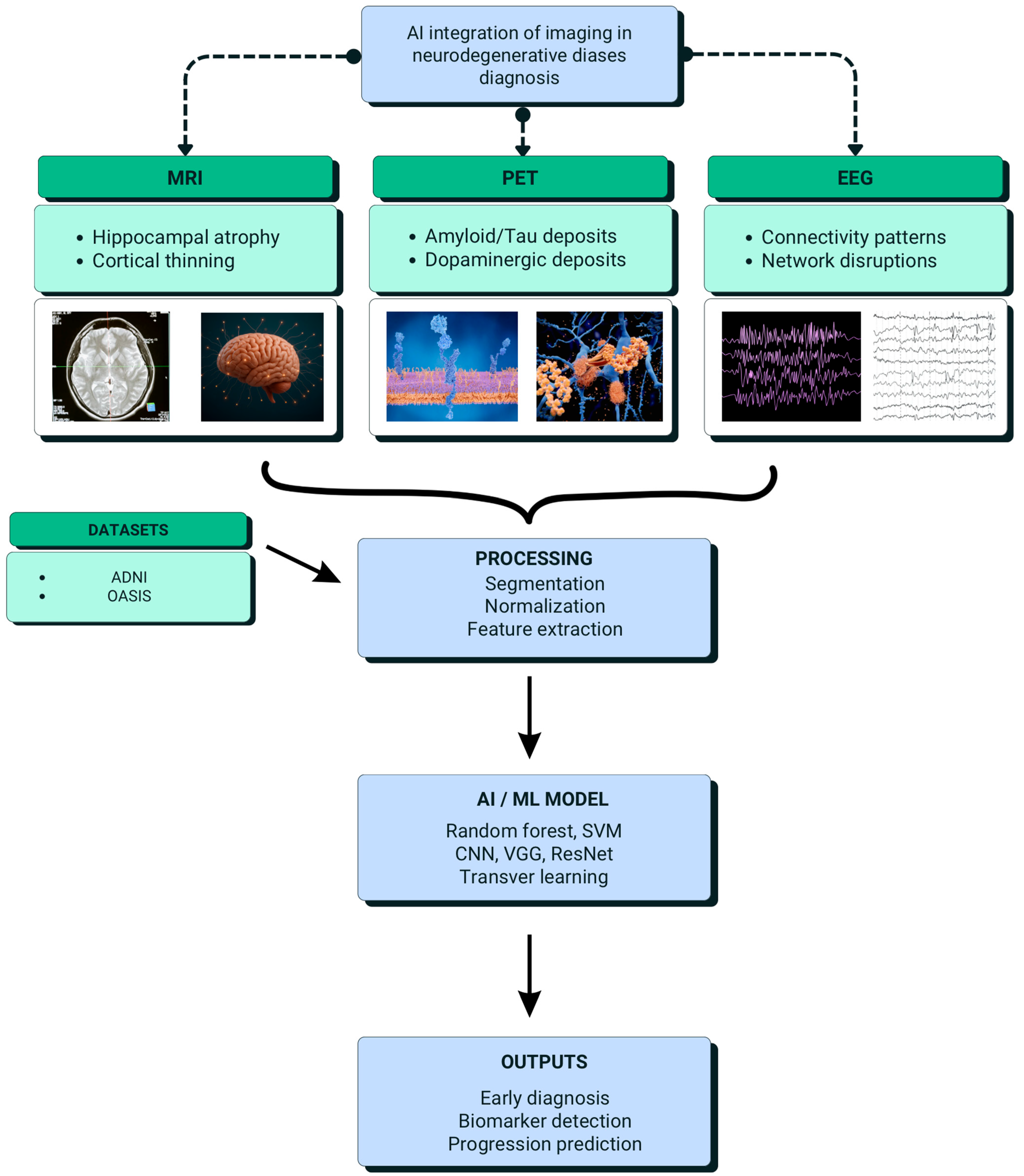 Brain imaging with computer learning (MRI, PET, EEG) | Diagnosis (early detection, staging) | Captures structural, functional, and molecular brain changes; combines multimodal data; large datasets exist. | Accuracy varies across scanners and hospitals; requires diverse data. | [63,64,65] |