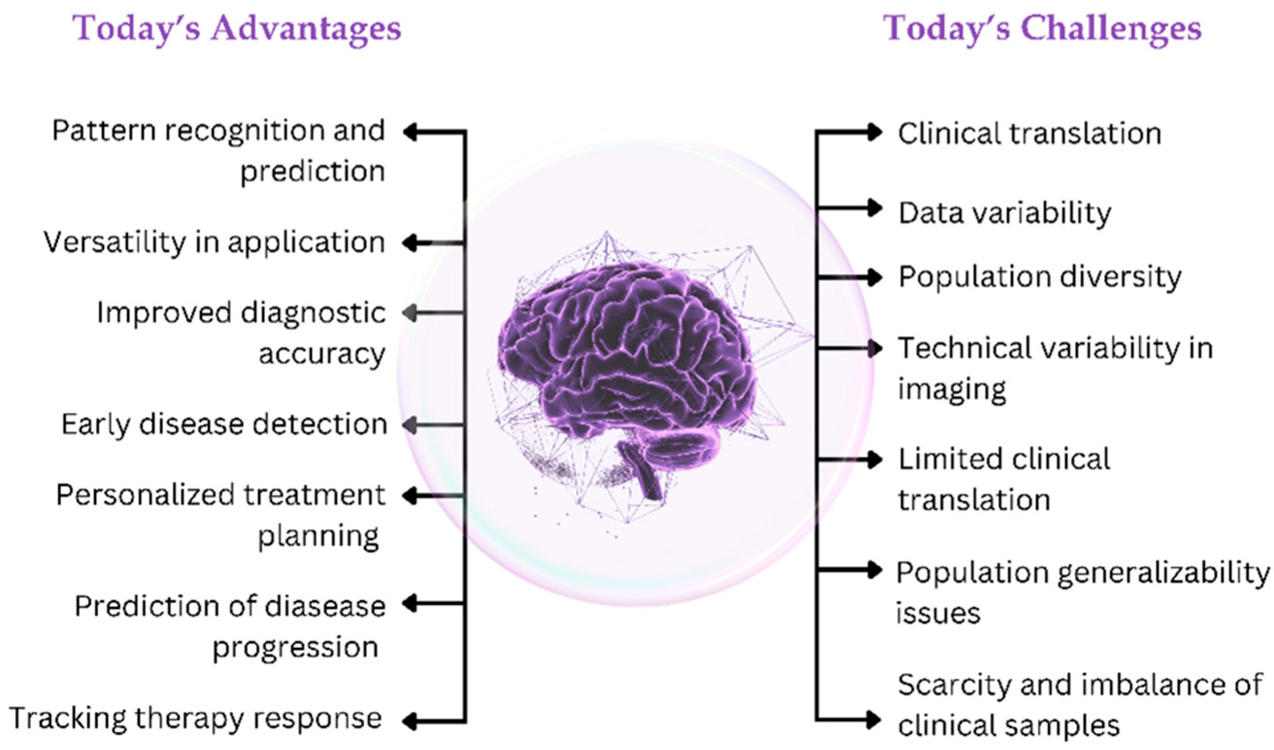 Artificial intelligence applied to gut microbiome | Diagnosis and treatment (biomarker discovery; guiding therapies) | Reveals associations between gut bacteria and Parkinson’s; supports personalized therapeutic strategies. | Data variability across studies; translation into clinical use still limited. | [90,91] |