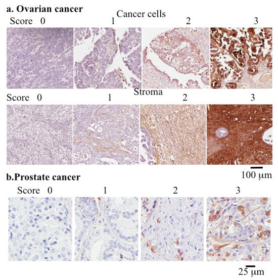 Use of COMP as a quantitative cancer biomarker. Immunolocalization of COMP in cancer cell and stromal tissue samples from ovarian cancer (a) and prostate cancer (b) used to determine the pathological grade of these conditions. Images reproduced from [272,277] under open access Creative Commons Attribution (CC-BY) licenses. Scale bars 100 μm in (a) and 25 μm in (b).