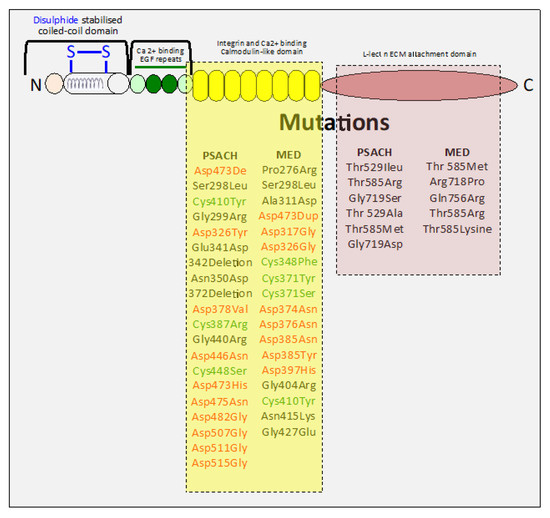 Mutations in COMP cause pseudoachondroplasia [73], a severe dwarfing condition associated with premature joint degeneration and significant lifelong joint pain and less severe multiple epiphyseal dysplasia [72]. A novel COMP variant with health consequences has been shown to induce multiple epiphyseal dysplasia and osteochondritis dessicans [296]. Over 40 frame insertion/deletion mutations in the COMP gene cause the skeletal dysplasias, pseudoachondroplasia and less severe multiple epiphyseal dysplasia [36,297,298,299] (Figure 4). Pseudochondroplasia is almost exclusively caused by COMP mutations, whereas various forms of multiple epiphyseal dysplasia have been attributed to mutations in the genes encoding COMP, type IX collagen COL9A1, COL9A2, and COL9A3chains and matrilin-3 [299]. Two novel mutations, (i) a gross deletion spanning an exon–intron junction exon deletion and (ii) a frameshift mutation resulting in a truncation of the C-terminal domain, have also been identified [299]. The majority of COMP mutations affect the highly conserved aspartate or cysteine residues in the calmodulin-like repeat (CLR) region of COMP. Mutations in the CLR domain produce individuals of severe short stature. Patients carrying mutations within the five-aspartate repeats in amino acids 469–473 in the seventh CLR domain are of extremely short stature. Deletion mutations produce significantly shorter skeletal forms than those in individuals with substitution mutations. A novel mutation in exon 18 of COMP in the C-terminal globular domain has been identified as one producing a severe pseudoachondroplasia phenotype with marked short stature, spinal deformities and deformed skeletal appendages [300]. These results demonstrate unique bouquet-like COMP presentations in the C-terminal domains as key functional regions amenable as molecular templates for the production of engineered proteins with novel functions. Screening for mutations in the COMP gene, which can lead to PSACH and some forms of MED, have been used to aid in the clinical diagnosis and counseling of patients [301].
