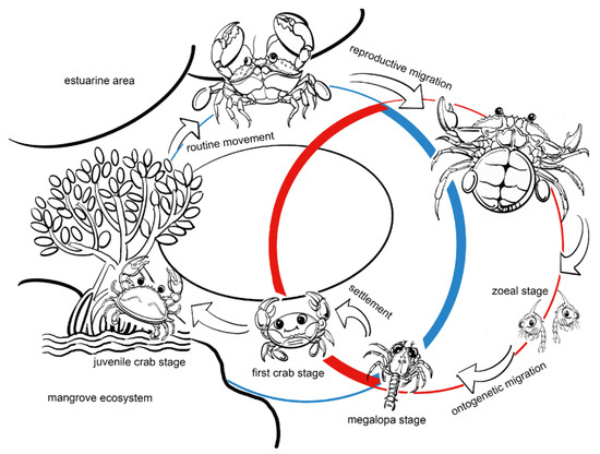 The mud crab S. paramamosain represents an economically important aquaculture species widely distributed across the Indo-West Pacific region, prized for its exceptional growth performance and substantial commercial value [14,15,16]. As a euryhaline organism, S. paramamosain inhabits waters of salinity around 5~33‰ [17], making it an ideal model for studying osmoregulation in brachyuran crabs [9]. However, rapid salinity fluctuations can cause severe physiological stress and elevated mortality rates, particularly during sensitive ontogenetic stages [11]. Exhibiting a biphasic life cycle strategy, S. paramamosain undergoes distinct ontogenetic habitat shifts between offshore marine and inshore estuarine environments (Figure 1). Zoeal stages primarily develop in high-salinity marine waters, reflecting an oceanic spawning adaptation. During the zoea-to-megalopa transition, larvae migrate toward estuarine nursery habitats, experiencing dramatic salinity decreases that challenge their osmoregulatory systems [18]. Following subsequent molting, megalopae metamorphose into juvenile crabs capable of inhabiting even lower salinity environments. After undergoing several molting cycles, mature individuals return to the higher salinity of the ocean for reproduction. The megalopa stage represents a critical developmental transition in S. paramamosain, characterized by substantial physiological adaptations during the high-to-low salinity habitat shift. Given the extended transition period and high mortality rates observed during commercial larval rearing of S. paramamosain, investigating megalopa osmoregulatory mechanisms is essential for enhancing survival rates and optimizing aquaculture production [11,15,16,19,20].