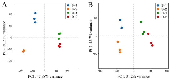 PCA demonstrated clear segregation among the four groups along the principal coordinates (Figure 2). Transcriptomic PCA exhibited tight clustering of biological replicates within each treatment group (B-1: acute stress; B-2: acute control; D-1: prolonged stress; and D-2: prolonged control) (Figure 2A). The first two principal components (PC1 and PC2) collectively explained 77.59% of total variance (PC1: 47.38%; PC2: 30.21%), indicating strong discriminatory power. The results reflected that the transcriptomic profiles of different treatment groups were well separated, reflecting high data reproducibility and reliable sequencing quality.
