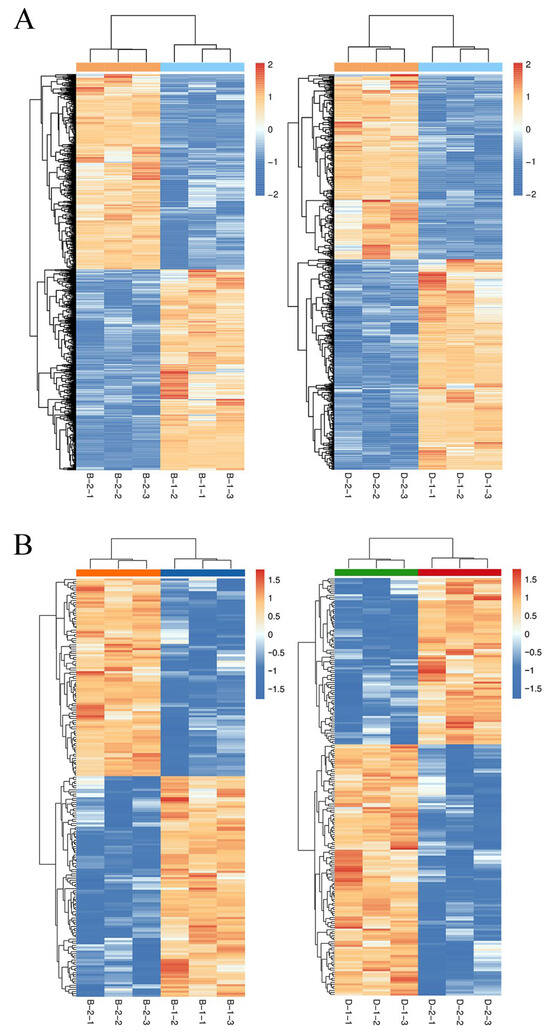 Heatmap of the DEGs (A) and DEPs (B) in the comparisons of B-1 vs. B-2 and D-1 vs. D-2 under low-salinity stress (p value < 0.05). Three biological replicates were performed in each group. B-1, acute stress (2 h, 8‰); B-2, acute control (2 h, 17‰); D-1, chronic stress (72 h, 8‰); and D-2, chronic control (72 h, 17‰).