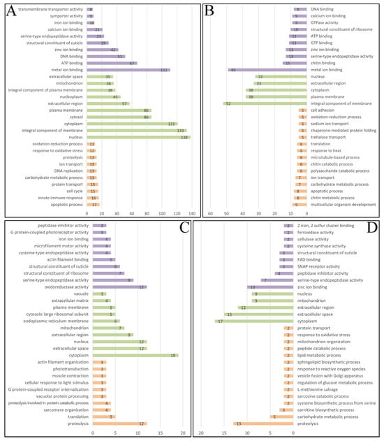 GO enrichment analysis of acute stress-responsive DEGs (B-1 vs. B-2) revealed 1887 classifications, distributed across three ontologies: biological process (BP, 1171 terms), molecular function (MF, 435 terms) and cellular component (CC, 281 terms). The predominant BP categories (Figure 4A) included apoptotic process (GO:0006915), innate immune response (GO:0045087), cell cycle (GO:0007049), protein transport (GO:0015031), carbohydrate metabolic process (GO:0005975), DNA replication (GO:0006260), ion transport (GO:0006811), proteolysis (GO:0006508), response to oxidative stress (GO:0006979) and oxidation-reduction process (GO:0055114), reflecting core stress adaptation mechanisms. In the CC analysis, nucleus (GO:0005634), integral component of membrane (GO:0016021), and cytoplasm (GO:0005737) were the top three items. While metal ion binding (GO:0046872), ATP binding (GO:0005524), DNA binding (GO:0003677), zinc ion binding (GO:0008270), structural constituent of cuticle (GO:0042302), serine-type endopeptidase activity (GO:0004252), calcium ion binding (GO:0005509) and iron ion binding (GO:0005506) were the most significantly enriched terms in the MF.
