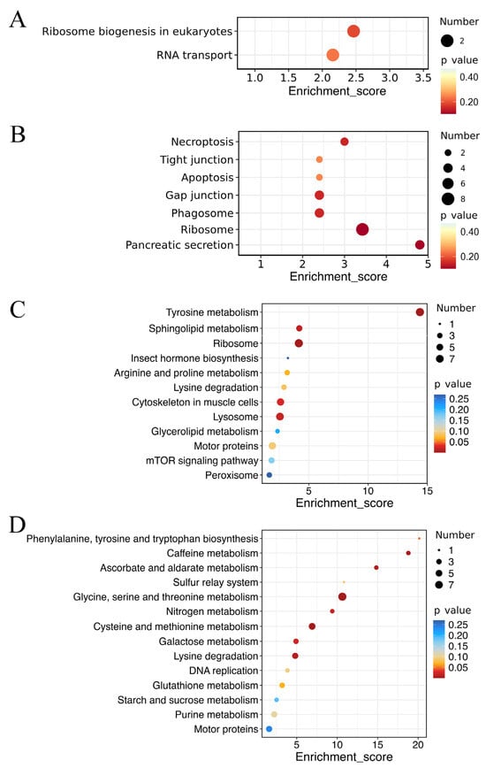 KEGG enrichment analyses of differentially expressed genes (DEGs) and proteins (DEPs) under acute and chronic low-salinity stress. The X axis represented the enrichment score, while the Y axis represented the functional pathways of KEGG. (A) DEGs in acute stress vs. acute control (B-1 vs. B-2, transcriptome); (B) DEGs in chronic stress vs. chronic control (D-1 vs. D-2, transcriptome); (C) DEPs in acute stress vs. acute control (B-1 vs. B-2, proteome); and (D) DEPs in chronic stress vs. chronic control (D-1 vs. D-2, proteome). Proteomic KEGG analysis revealed broader pathway enrichment, indicating extensive post-transcriptional regulation. Acute stress DEPs (B-1 vs. B-2) were enriched in tyrosine metabolism (esn00350), ribosome (esn03010), sphingolipid metabolism (esn00600), lysosome (esn04142) and cytoskeleton in muscle cells (esn04820), suggesting immediate metabolic shifts and cytoskeletal remodeling critical for maintaining cellular stability (C). Prolonged exposure (the comparison of D-1 vs. D-2) revealed that DEPs were significantly enriched in the pathways of glycine, serine, and threonine metabolism (esn00260), cysteine and methionine metabolism (esn00270), caffeine metabolism (esn00232), ascorbate and aldarate metabolism (esn00053), nitrogen metabolism (esn00910), galactose metabolism (esn00052) and lysine degradation (esn00310) (D), highlighting persistent amino acid metabolic adjustments and protein processing as essential strategies for chronic low-salinity adaptation.