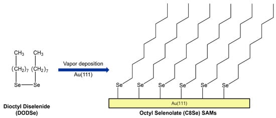 Chemical structure of dioctyl diselenide (DODSe) and the formation of C8 Se SAMs on Au(111) by the adsorption of DODSe molecules from ambient-pressure vapor deposition.