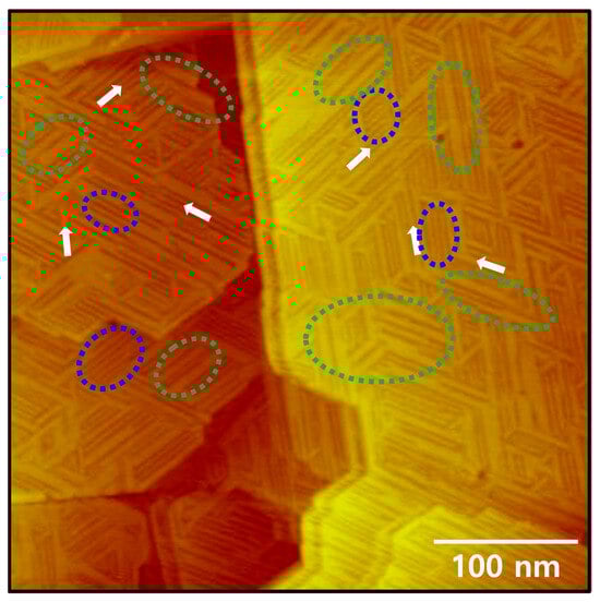 Large-scale STM image (400 nm × 400 nm) showing the unique surface features of C8Se SAMs on Au(111) formed by vapor deposition at 363 K for 1 h. Tri-directional domain orientations are indicated by white arrows. Narrow and wide rows are indicated by blue and green dotted ovals.