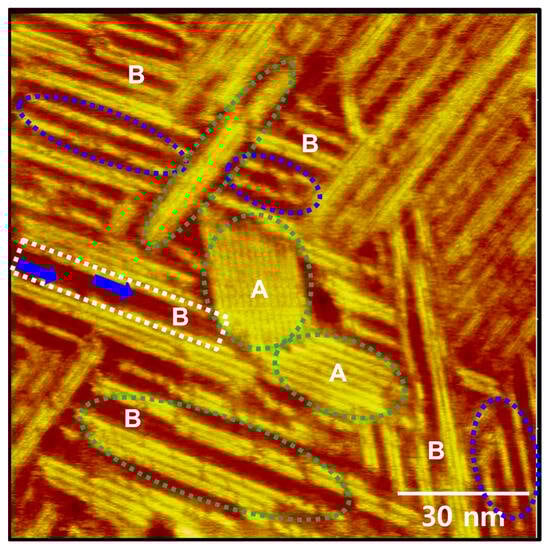 Enlarged STM image (120 nm × 120 nm) in Figure 3 shows that various types of ordered molecular rows for C8Se SAMs on Au(111) formed by vapor deposition at 363 K for 1 h. Figure 3 clearly reveals that the narrow, bright ordered rows in STM image of Figure 2 usually consist of single molecular rows (indicated by blue dotted ovals), whereas the wide, bright ordered rows consist of multiple molecular rows (indicated by green dotted ovals). In particular, the short-range ordered domains, labeled A, were formed after many molecular rows coalesced due to the growth of SAMs. Dark regions between the bright ordered rows were also observed, labeled B. The height difference between the ordered rows and the dark region B was found to be less than 1 Å, which is much smaller than molecular length of C8Se, 14.3 Å [] or vacancy islands with a depth of 2.5 Å that often appeared from thioate or selenolate SAMs [,,,,,,,,,,,,]. This result means that the dark region is not bare gold surface or vacancy islands. High-resolution STM image reveals the presence of molecular rows in the dark region indicated by blue arrows (within the white dotted rectangular box). Therefore, it is assumed that the octyl chains in C8Se SAMs in the dark region are more inclined toward the Au(111) surface, suggesting that the surface coverage in the dark region is lower than that in the bright region. This suggestion can be supported by the fact that loosely packed thiolate monolayers show darker imaging contrast than densely packed monolayers in STM observations [,,]. Similar results showing a mixed phase containing dark and bright ordered domains were observed for octyl selenocyanate SAMs on Au(111) formed via vapor deposition 348 K for 6 h []. Therefore, the presence of these inhomogeneous surface features of C8Se SAMs formed at 363 K for 1 h strongly suggests that the C8Se SAMs have not yet reached a thermodynamically stable phase, since densely packed thiolate or selenolate SAMs on Au(111) have a very uniform surface showing long-range ordered domains [,,,]. On the other hand, despite numerous attempts to obtain molecular-level surface structures of C8Se SAMs formed at 363 K for 1 h, observing individual molecules in the molecular rows is extremely difficult. This is likely due to the lack of crystallinity of the C8Se SAMs, which can be supported by the presence of various structural phases as shown in Figure 3.
