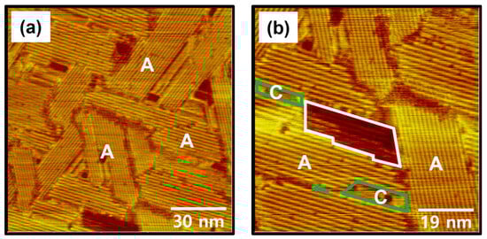 STM images showing well-ordered domains of C8Se SAMs on Au(111) formed by vapor deposition at 363 K for 6 h. The scan sizes of the STM images are (a) 120 nm × 120 nm and (b) 76 nm × 76 nm. Ordered and disordered domains are indicated by A and C (green solid lines). Vacancy islands are indicated by white solid lines.