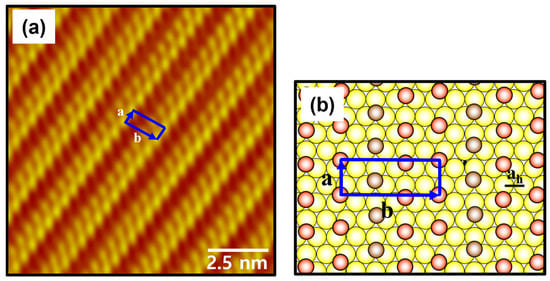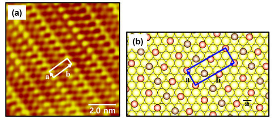 (a) A low-pass filtered high-resolution STM image (10 nm × 10 nm) of C8Se SAMs on Au(111) formed by vapor deposition at 363 K for 24 h. (b) A proposed structural model of C8Se SAMs on Au(111). The red and peanut-colored circles correspond to C8Se molecules, and the yellow circles correspond to Au atoms in the structural model. The unit cell is indicated by a blue square, and the unit cell vectors a and b are indicated in the STM image and structural model.
