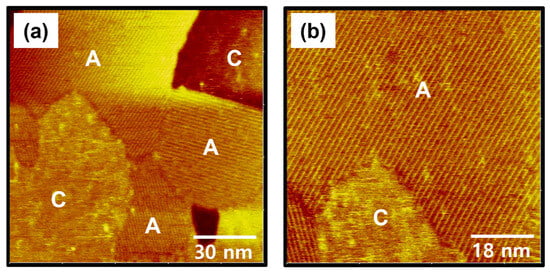 STM images showing the mixed phase of C8Se SAMs on Au(111) formed by vapor deposition at 363 K for 24 h. The scan sizes of the STM images are (a) 120 nm × 120 nm and (b) 72 nm × 72 nm. Ordered and disordered domains are indicated by A and C.
