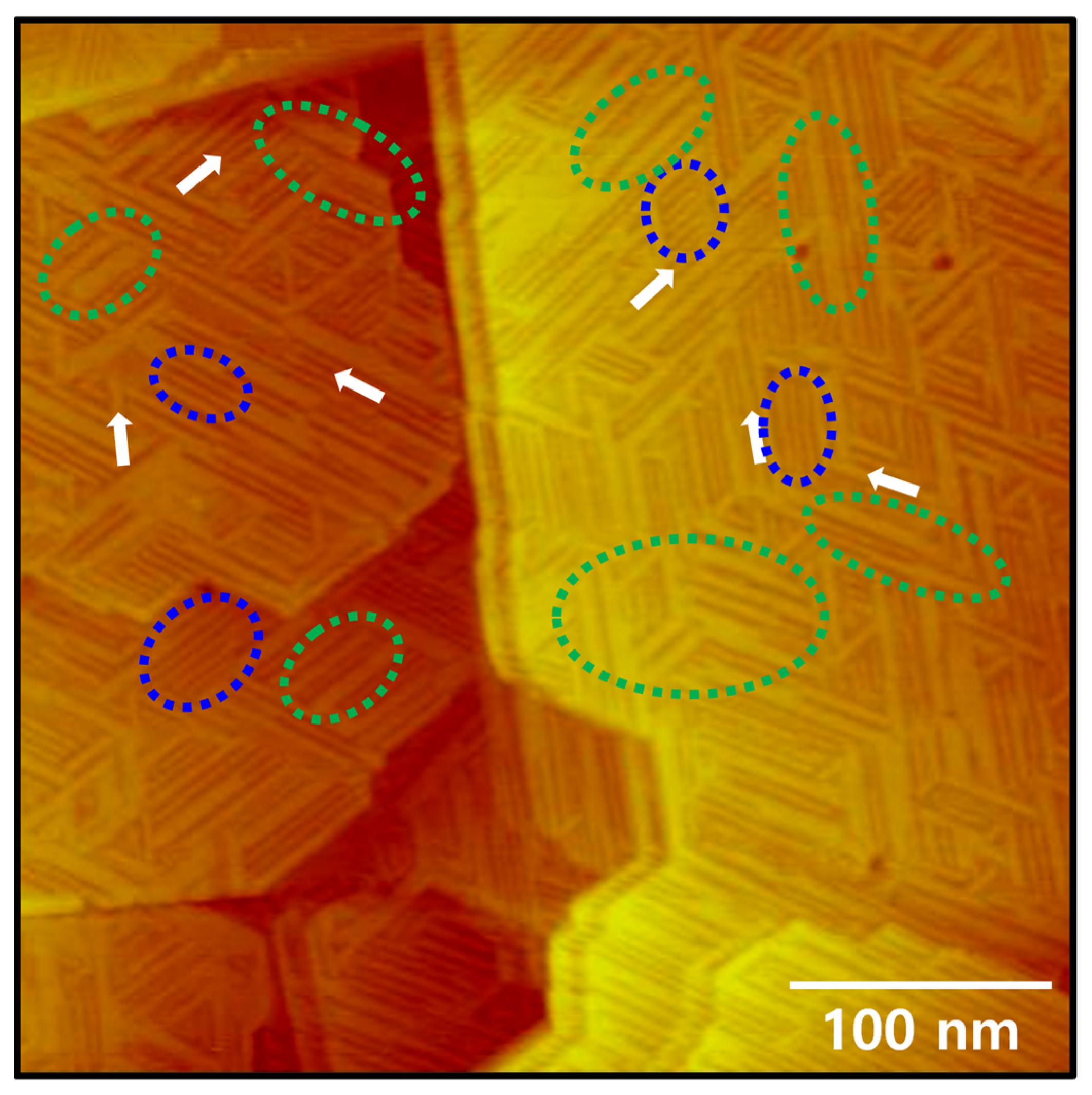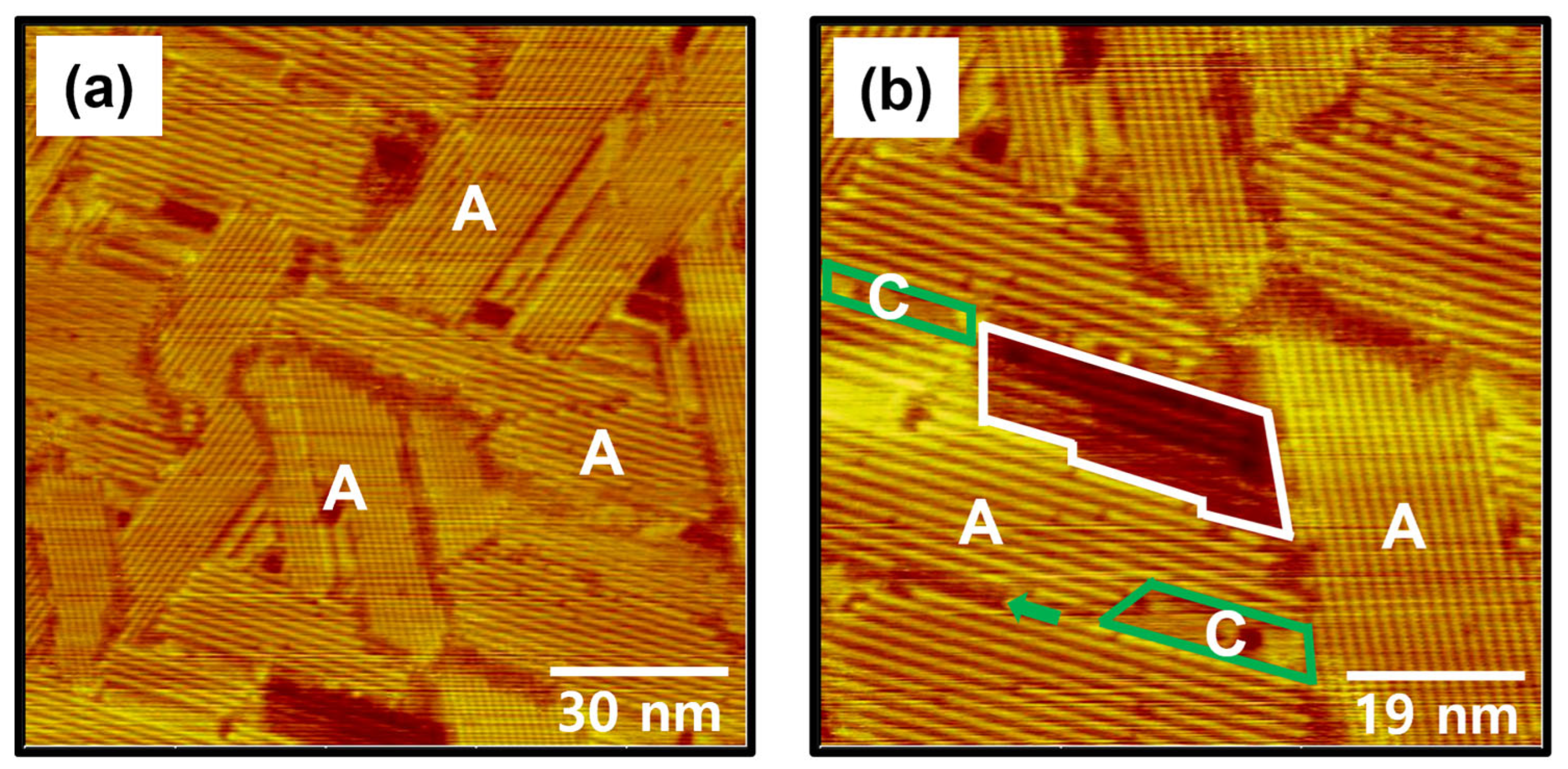 - Choi, J.; Kang, H.; Ito, E.; Hara, M.; Noh, J. Phase Transition of Octaneselenolate Self-Assembled Monolayers on Au(111) Studied by Scanning Tunneling Microscopy. Bull. Korean Chem. Soc. 2011, 32, 2623–2627. [Google Scholar] [CrossRef][Green Version]