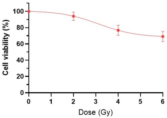 The characteristic shoulder on the survival curve at a dose of 2 Gy is clearly visible in Figure 1, indicating the cells’ ability to repair radiation damage. With an increase in IR dose, there is a sharp decrease in the number of viable tumor cells to 79.7 ± 5.3% for 4 Gy and 69.1 ± 6.1% for 6 Gy, compared to the control (100 ± 5.4%).