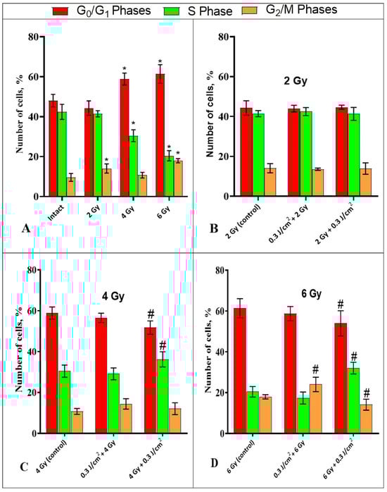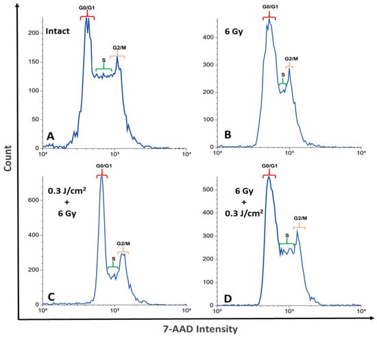 DNA content distribution across cell cycle phases: intact sample (A); after exposure to 6 Gy (B); 0.3 J/cm2 + 6 Gy (C); 6 Gy + 0.3 J/cm2 (D). For flow cytometric analysis, 10,000 events were recorded per sample.