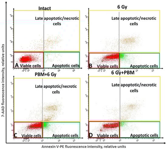 An example of the distribution of populations into late apoptotic/necrotic, early apoptotic, and living cells. Intact sample (A); after exposure to 6 Gy (B); with complex exposure 0.3 J/cm2 + 6 Gy (C); and 6 Gy + 0.3 J/cm2 (D). For flow cytometric analysis, 10,000 events were recorded per sample.