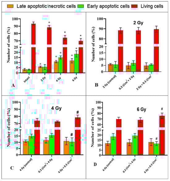 The ratio of late apoptotic/necrotic, early apoptotic, and living HeLa cells following experimental treatments. (A)—exposure to IR in different doses compared to an intact sample. (B–D)—effects of combinations of “PBM→IR” and “IR→PBM” compared with the corresponding control (2 Gy, 4 Gy, and 6 Gy without PBM). Data are mean ±SD (n = 4 biological replicates). *—statistically significant differences relative to the “intact” group, p < 0.05. #—statistically significant differences relative to the “control” group, p < 0.05.