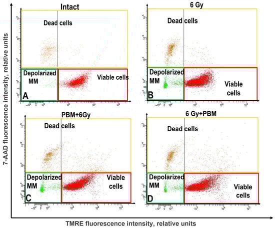 An example of cell distribution across populations: viable, dead, and with a depolarized mitochondrial membrane. Intact sample (A); after exposure to 6 Gy (B); with complex exposure 0.3 J/cm2 + 6 Gy (C); and 6 Gy + 0.3 J/cm2 (D). For flow cytometric analysis, 10,000 events were recorded per sample.