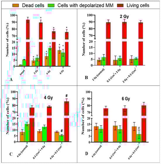 The ratio of viable, dead, and depolarized cells (MM) following experimental treatments. (A)—exposure to IR in different doses compared to an intact sample. (B–D)—combined effects in combinations of “PBM→IR” and “IR→PBM” compared with the corresponding control without PBM. Data are mean ±SD (n = 4 biological replicates). *—statistically significant differences relative to the “intact” group, p < 0.05. #—statistically significant differences relative to the “control” group, p < 0.05.