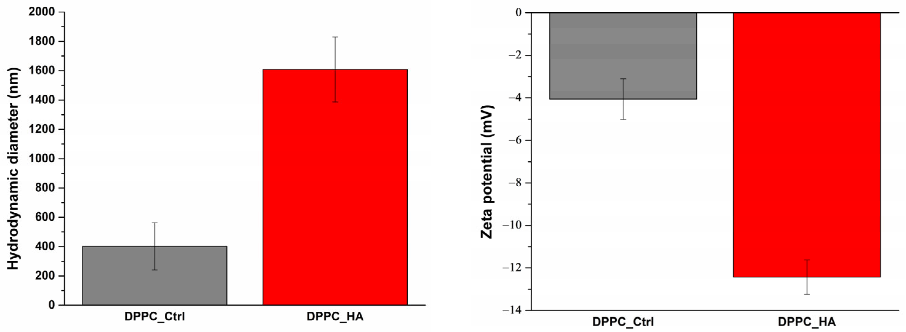 Figure 1. DLS analysis results for DPPC_Ctrl and DPPC_HA samples: (left) hydrodynamic diameter, and (right) zeta potential.
