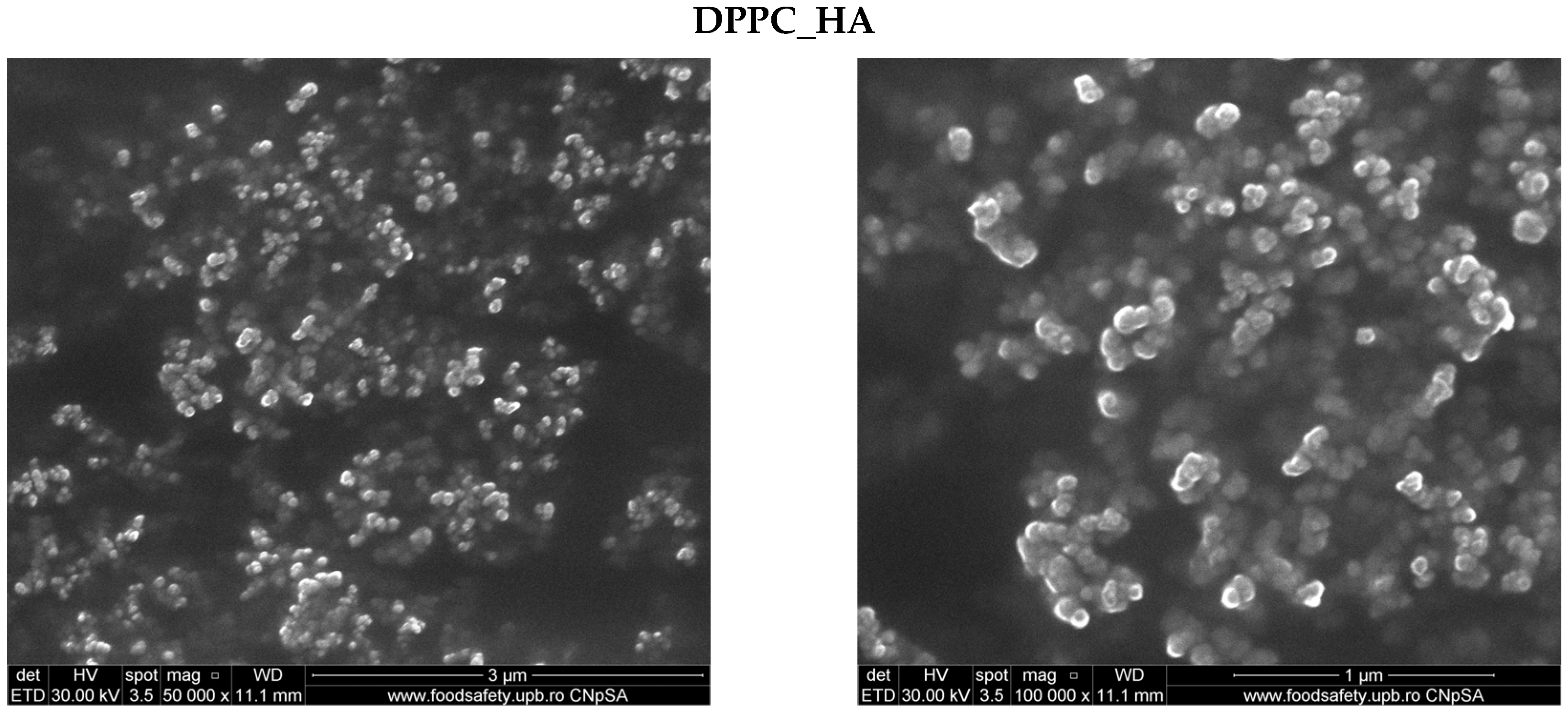 SEM images (Figure 2) illustrate vesicle-like domains for both the DPPC_Ctrl and DPPC_HA samples. The micrographs suggest the presence of nanoscale lipid structures, although aggregation effects are evident, and resolution limitations prevent detailed morphological interpretation. While spherical features can be discerned, SEM is not ideally suited for hydrated lipid systems, and the images should be regarded as qualitative support for vesicle formation rather than definitive morphological proof.