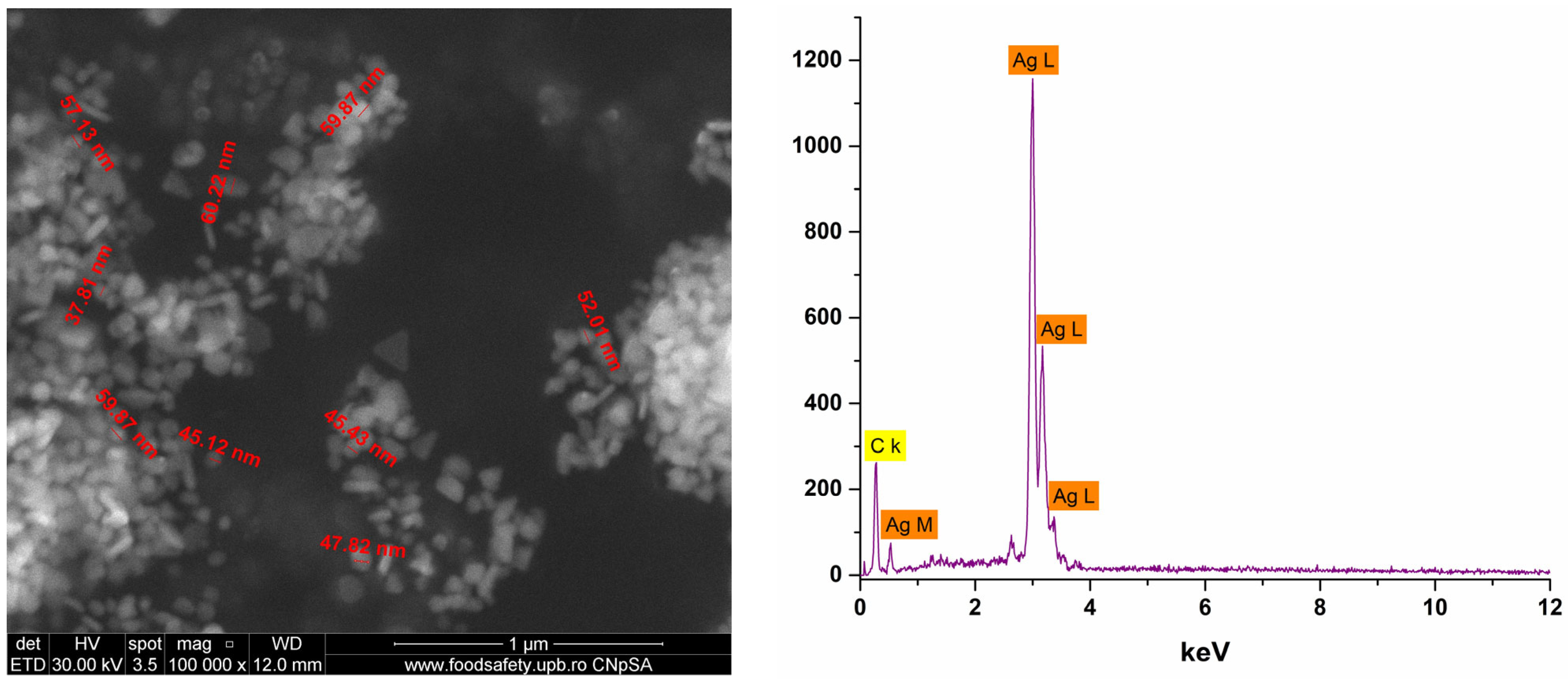 Additional SEM micrographs confirmed the nanometric scale of the Ag_Aro particles, with average dimensions ranging from 30 to 60 nm (Figure 5). The particles displayed polydisperse morphology, including spherical, quasi-spherical, triangular, truncated triangular, and elongated shapes. Such morphological diversity can impact biological activity, with truncated triangular particles offering increased surface area and potentially enhanced antimicrobial effects compared to spherical counterparts [36]. Furthermore, EDS analysis confirmed the elemental composition, identifying silver (Ag) and carbon (C). The carbon signal originates from the carbon tape used during SEM sample preparation. EDS analysis confirmed the presence of silver and a carbon background from the support tape. No clear signals from other elements were detected; however, due to its limited sensitivity for light elements (C, O, N), EDS cannot exclude the presence of organic stabilizing compounds derived from Aronia at the nanoparticle surface.