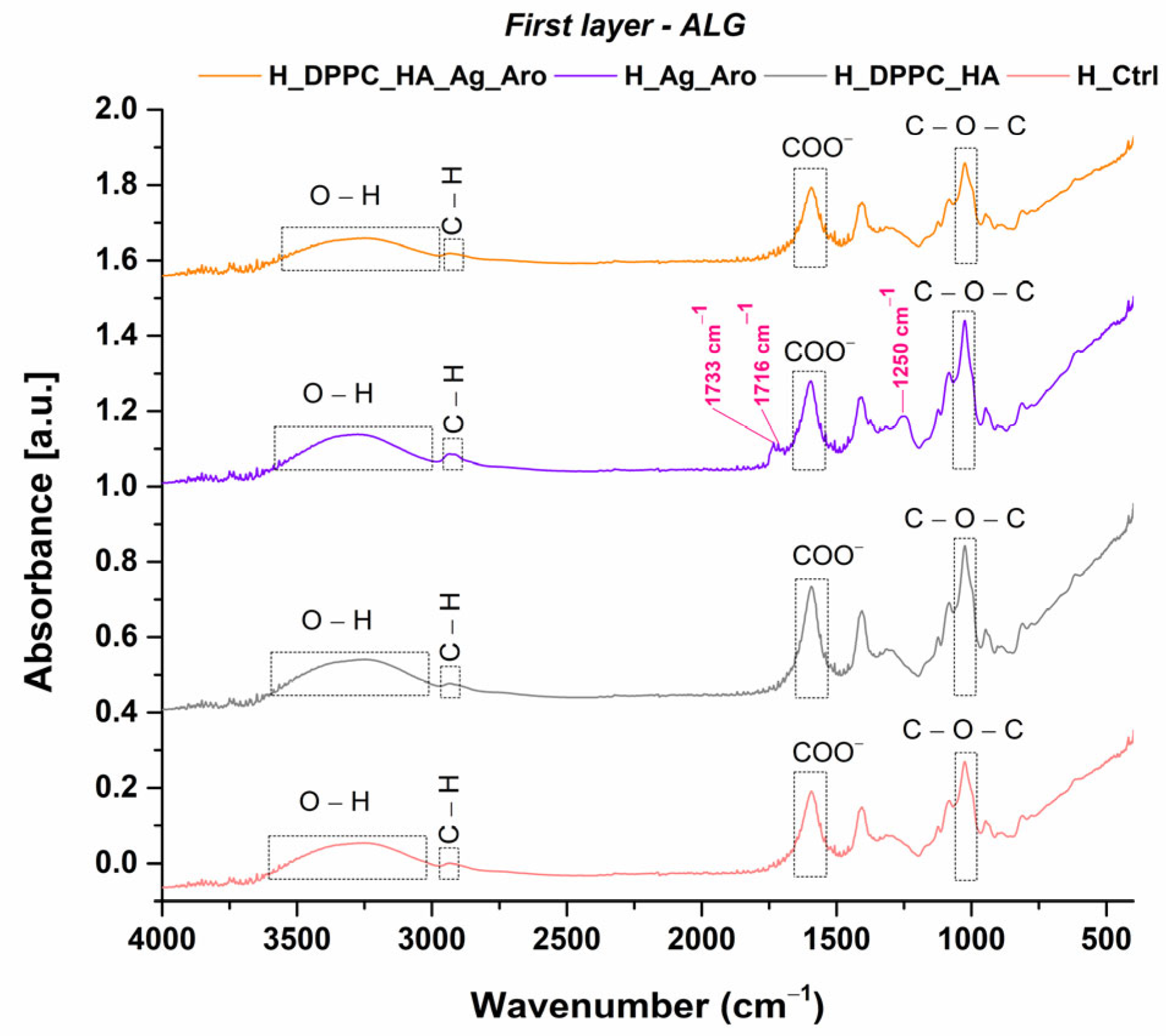 FTIR spectra were recorded for each layer of every sample. Figure 6 and Figure 7 compare the results corresponding to the first ALG layer, both unmodified and modified with Ag_Aro, and the second PVA layer, both unmodified and incorporating DPPC_HA liposomes.