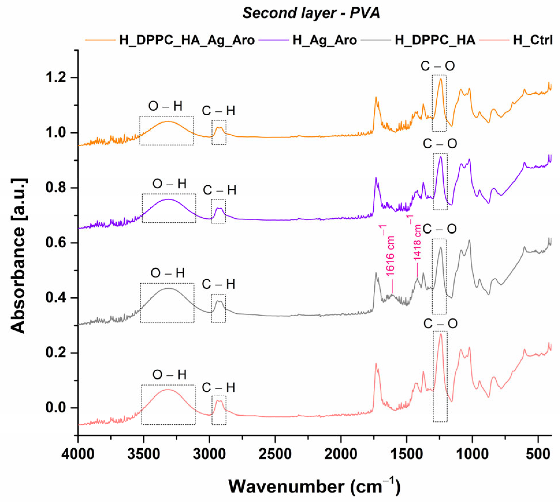 The FTIR spectra of the PVA layer exhibit characteristic bands of this polymer. The band between 3000–3500 cm−1 corresponds to O–H stretching vibrations, and displays intensity changes according to the characteristics of each sample. The bands in the 2918–2938 cm−1 region are attributed to C–H stretching vibrations [62,66]. In the H_DPPC_HA spectrum, two additional absorption bands at 1616 cm−1 and 1418 cm−1 were observed, which are absent in the control and Ag_Aro containing samples. These bands are primarily attributed to the asymmetric and symmetric stretching vibrations of carboxylate groups (COO) from HA. The presence of DPPC_HA vesicles may influence the position and intensity of vibrational bands through non-covalent interactions with HA [66,67]. The band observed near 1239–1240 cm−1, corresponding to C–O stretching, further confirms the polymeric structure of PVA [68,69]. Compared to the control sample (H_Ctrl), the formulations containing DPPC_HA exhibit intensified carbonyl and hydroxyl bands, indicating successful incorporation of these bioactive components.
