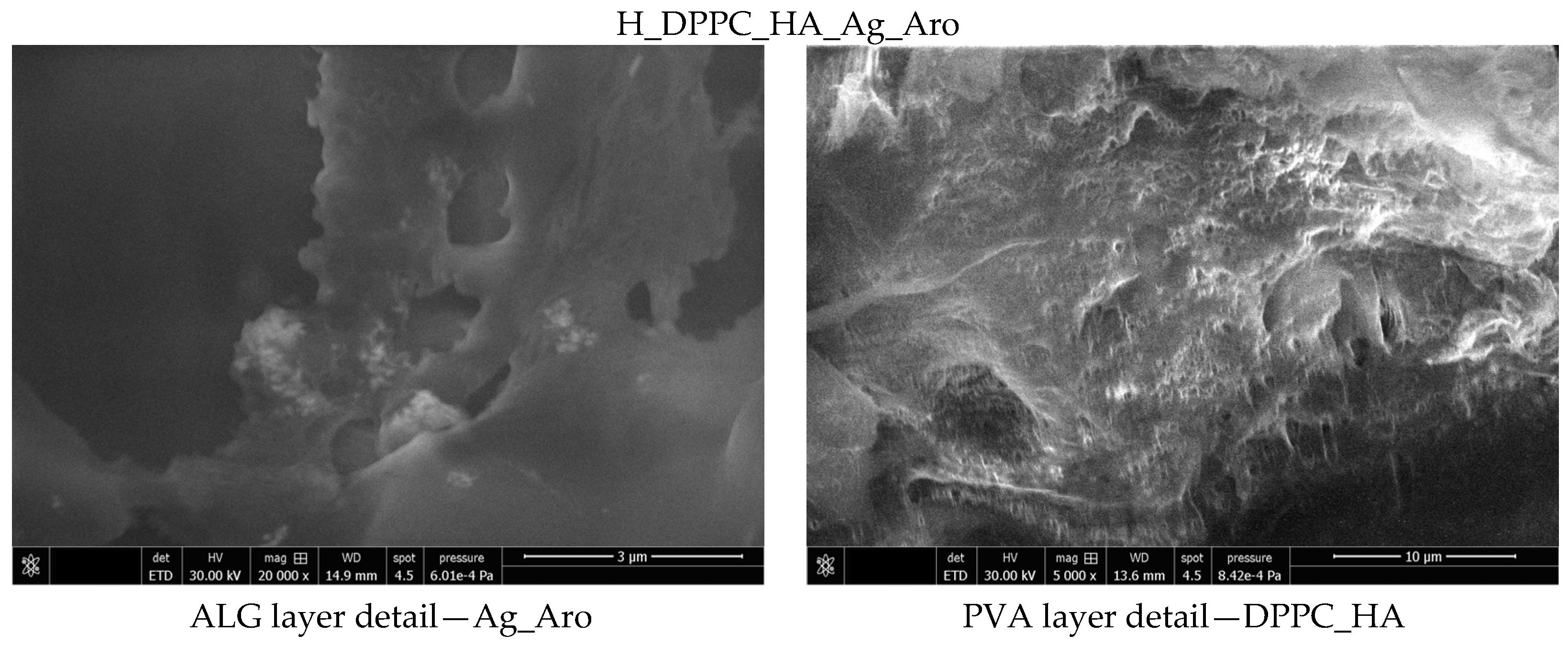 In the case of the H_DPPC_HA formulation, the ALG layer shows similarities to that of H_Ctrl, considering that both layers are free of any nanoparticles. On the other hand, in the PVA layer containing the DPPC_HA lipid vesicles, at 2000× magnification, certain voids can be observed, which were most likely formed due to the presence of these vesicles. The H_Ag_Aro dressing reveals the presence of silver nanoparticles through the markedly different morphology of the ALG layer compared to H_Ctrl and H_DPPC_HA. These nanoparticles are distributed within the dressing layers and contribute to the formation of additional pores compared to the arrangement observed in ALG layers without Ag_Aro. Regarding the dual active-agent formulation, H_DPPC_HA_Ag_Aro, structural differences induced by the addition of active agents in both polymeric layers of the dressing are evident. Figure 9 presents higher-magnification micrographs, which allow for easier visualization of the Ag_Aro nanoparticles, homogeneously dispersed but also forming agglomerates within the dressing layers. Additionally, predominantly spherical voids can be observed in the PVA layer, which can be associated with the presence of DPPC_HA vesicles embedded in the structure of the dressing.