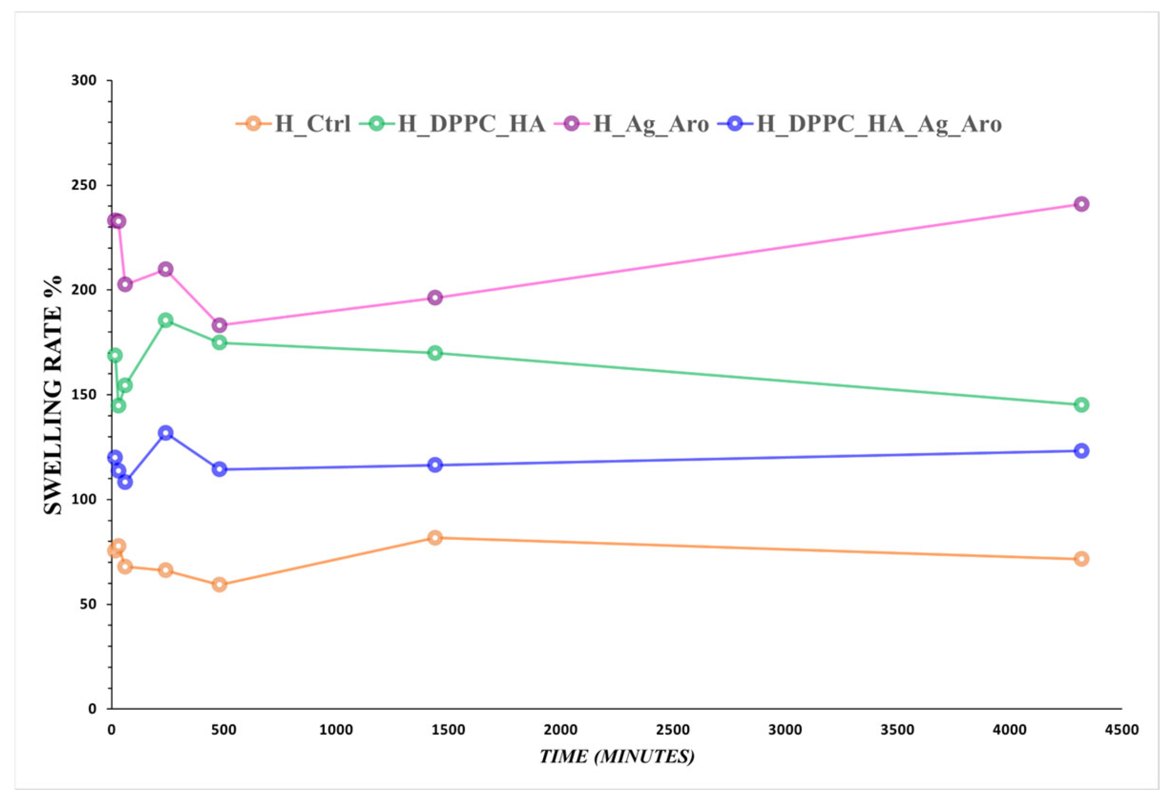The ability of the hydrogel dressings to swell in aqueous environments is of paramount importance in the development of ideal wound care materials, as this property enables the absorption of wound exudates [70]. The results obtained from this swelling study are comparatively displayed in Figure 10. Formulation H_Ag_Aro, which contains silver nanoparticles embedded in the alginate layer, exhibits the highest swelling rate across all measured time intervals. This enhanced swelling may result from the nanoparticles’ ability to reorganize the polymeric network, increasing porosity and facilitating greater water diffusion throughout the matrix [71,72]. The H_DPPC_HA formulation exhibited a moderate but gradually decreasing swelling trend, indicating a more compact polymer network that may be attributed to interactions between DPPC_HA and the polymeric matrix. The H_DPPC_HA_Ag_Aro formulation, containing both Ag_Aro nanoparticles and DPPC_HA liposomes, demonstrates a lower but consistently stable swelling profile. This behavior may reflect a more structured hydrogel architecture, which does not show significant variations in swelling behavior over an extended period of time. The reduced swelling observed in H_DPPC_HA and H_DPPC_HA_Ag_Aro may be explained by the compressive effect of the liposomes within the polymer matrix, potentially decreasing the initial porosity [73]. Conversely, H_Ctrl formulation showed the lowest swelling rates across all time points, as expected for a formulation lacking active agents that could modify network structure.