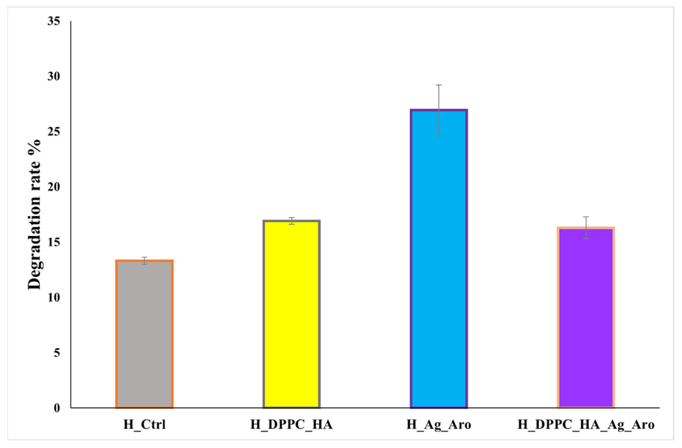 Another crucial feature for hydrogels is their degradation rate. In this respect, the degradation behavior of all developed hydrogels was evaluated after 72 h of immersion in PBS, leading to the results presented in Figure 11. As can be noted, the H_Ag_Aro formulation exhibited the highest degradation rate, which is consistent with the swelling rate evaluation, where this dressing recorded the highest values at all analyzed time points. The higher degradation rate observed for the H_Ag_Aro formulation is consistent with previous reports indicating that silver nanoparticles incorporated in hydrogel matrices are gradually released into the aqueous medium, leaving voids in the polymer network and accelerating mass loss. Similar findings have been reported for alginate–AgNP systems and other polysaccharide-based nanocomposites, where nanoparticle leaching disrupted matrix integrity and enhanced degradation kinetics [35,39,62]. The H_DPPC_HA formulation showed the next highest degradation rate. Similar to H_Ag_Aro, this aligns with its high swelling capacity, suggesting that, upon contact with the aqueous environment, the DPPC_HA lipid vesicles behave in a manner comparable to Ag_Aro nanoparticles, facilitating structural disintegration. In descending order of degradation rate, the following sample is H_DPPC_HA_Ag_Aro. Based on the results obtained for the individual active agent-containing dressings, this formulation would have been expected to exhibit the highest degradation rate. However, the data suggest a stabilizing effect when both active agents are present simultaneously, potentially resulting from interactions between the DPPC_HA lipid vesicles and Ag_Aro nanoparticles that enhance the structural integrity of the hydrogel matrix.