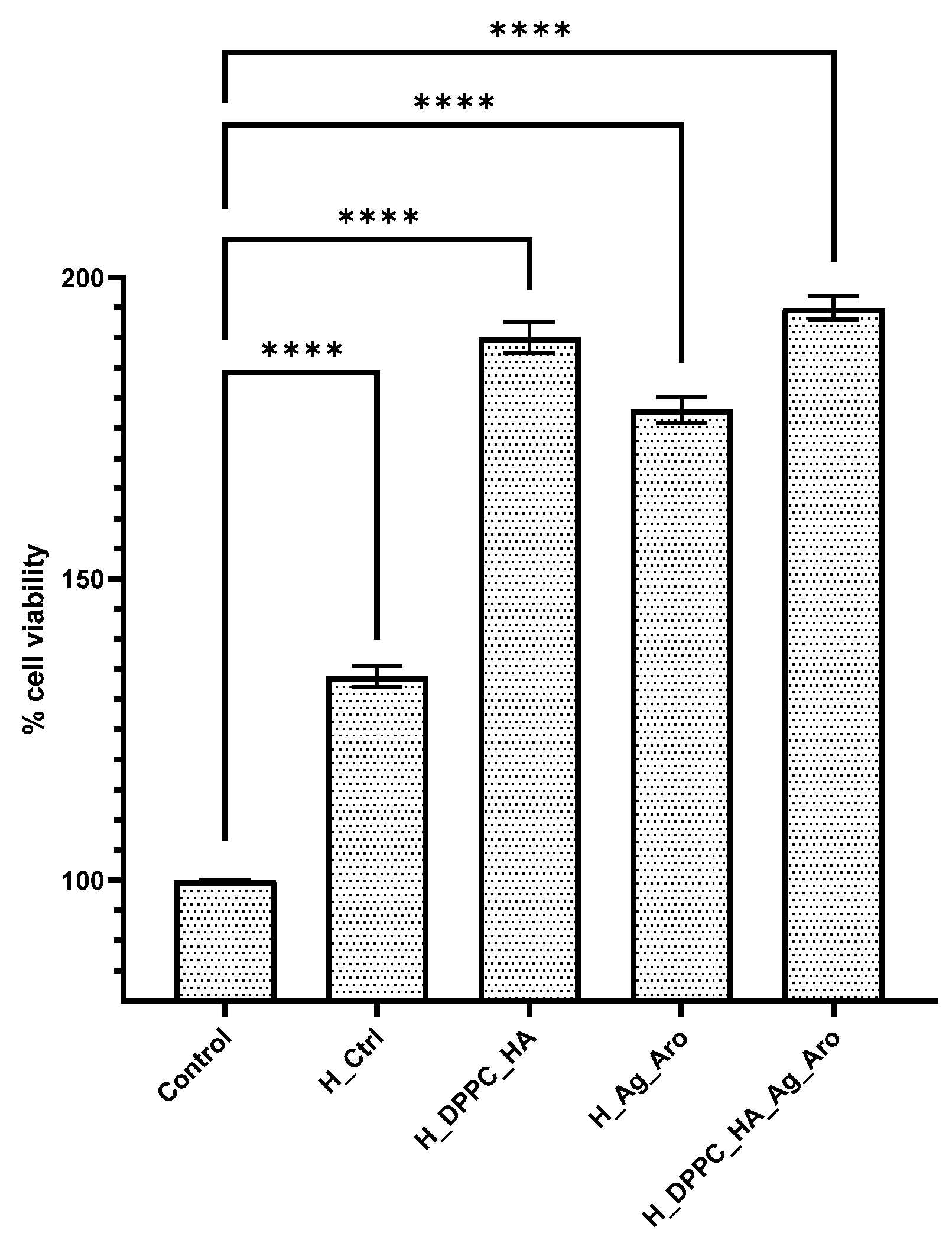 Figure 12. Graphical representation of human HaCaT keratinocytes viability after 24 h of contact with the tested samples (H_Ctrl, H_DPPC_HA, H_Ag_Aro, H_DPPC_HA_Ag_Aro). The represented data are the mean values of three independent experiments ± S.D. (**** p ≤ 0.0001 sample vs. control).